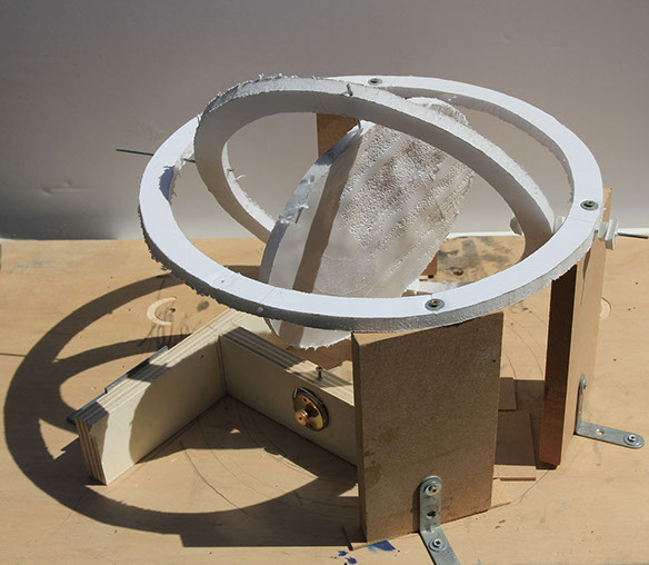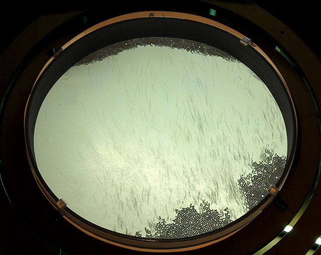 Vue de l'installation sonore, tambours océans, mécanique oscillatoire, chants émis par quatre haut-parleurs, 2017