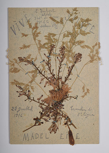 Carte de correspondance en franchise de Émile Imbert (1877-1916) adressée à son épouse Madeleine sur laquelle sont collées en bouquet quelques fleures séchées et graminées sauvages, 22 juillet 1916, tranchées de 3ème ligne. Vive Madeleine
