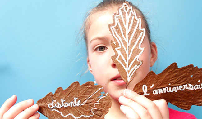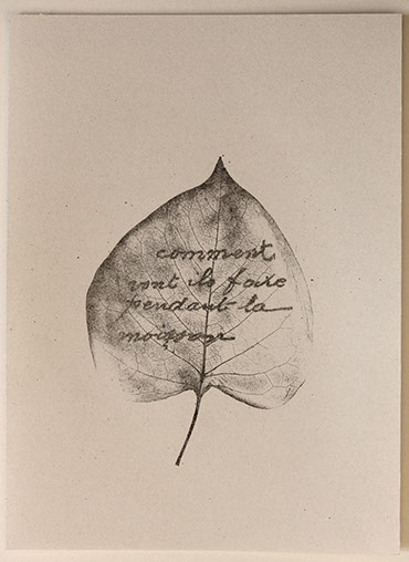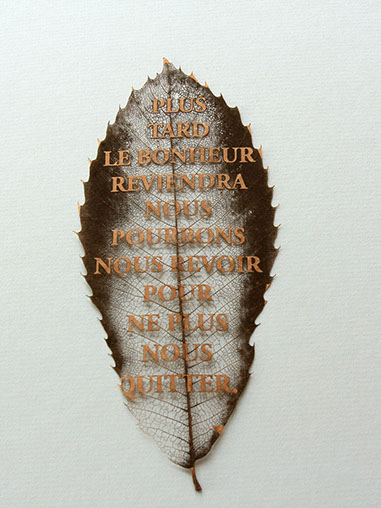 gravure laser sur feuille d'arbre, textes extraits de correspondances de Poilus, 2017